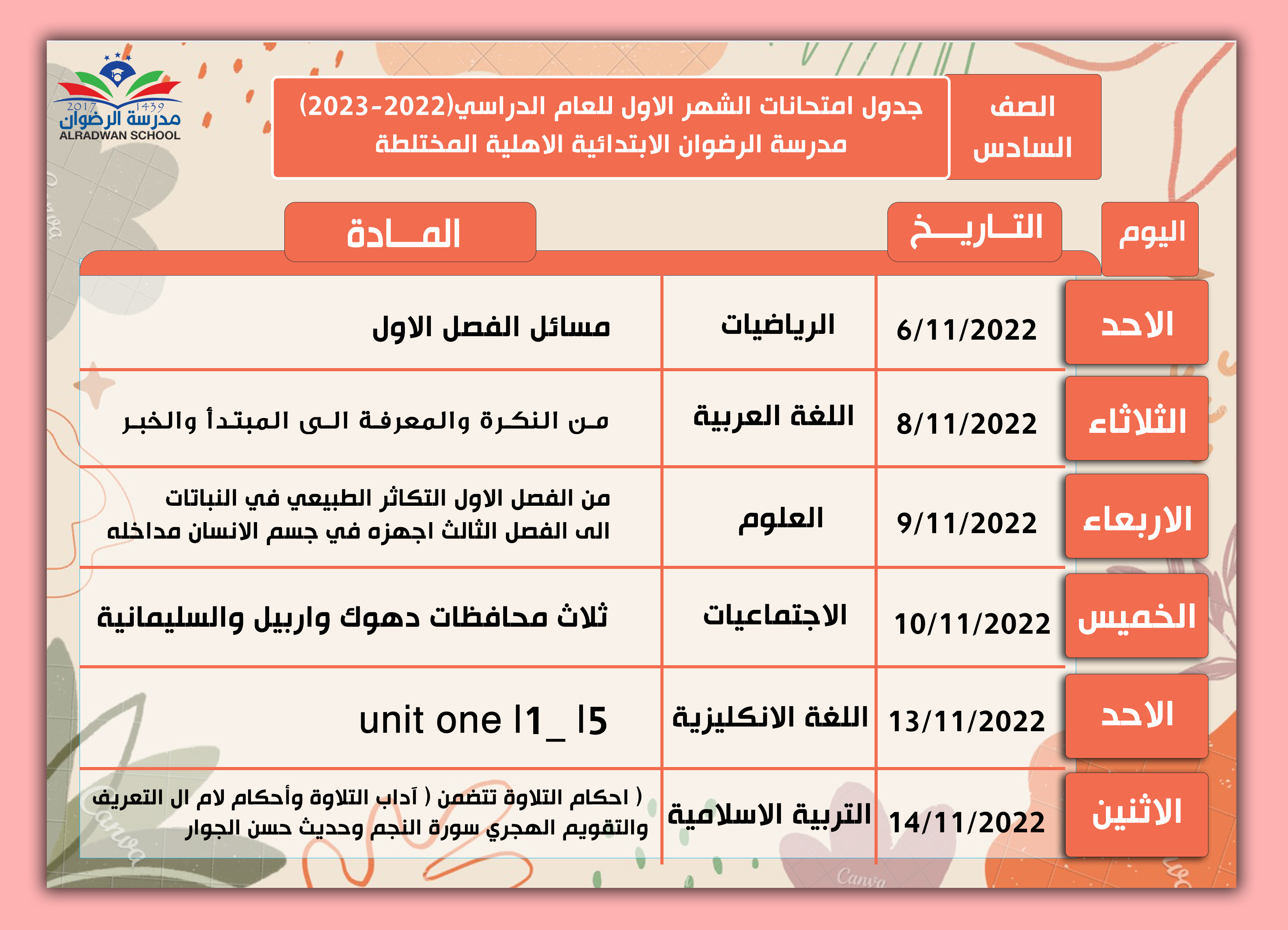 جدول امتحان الشهر الاول