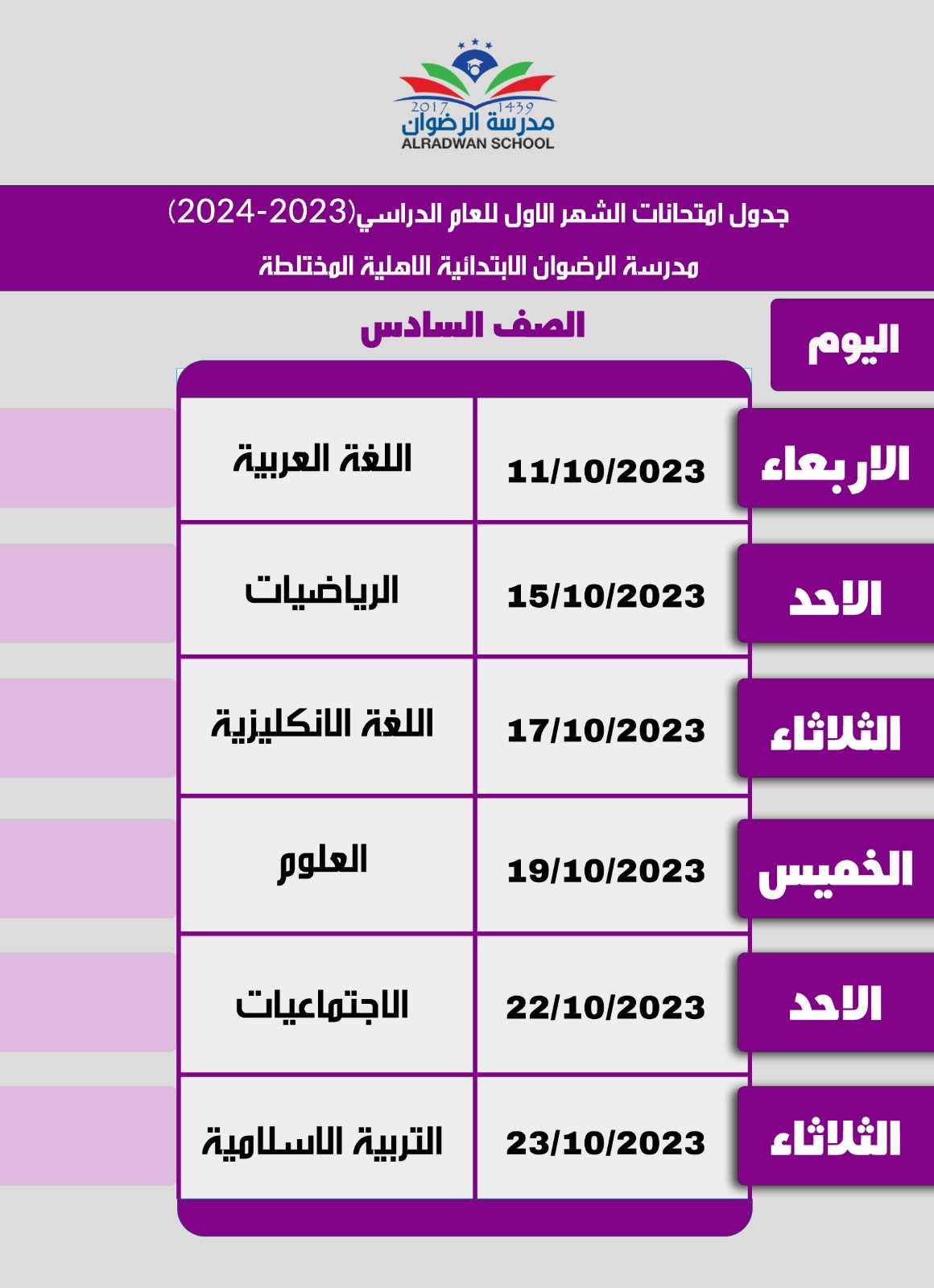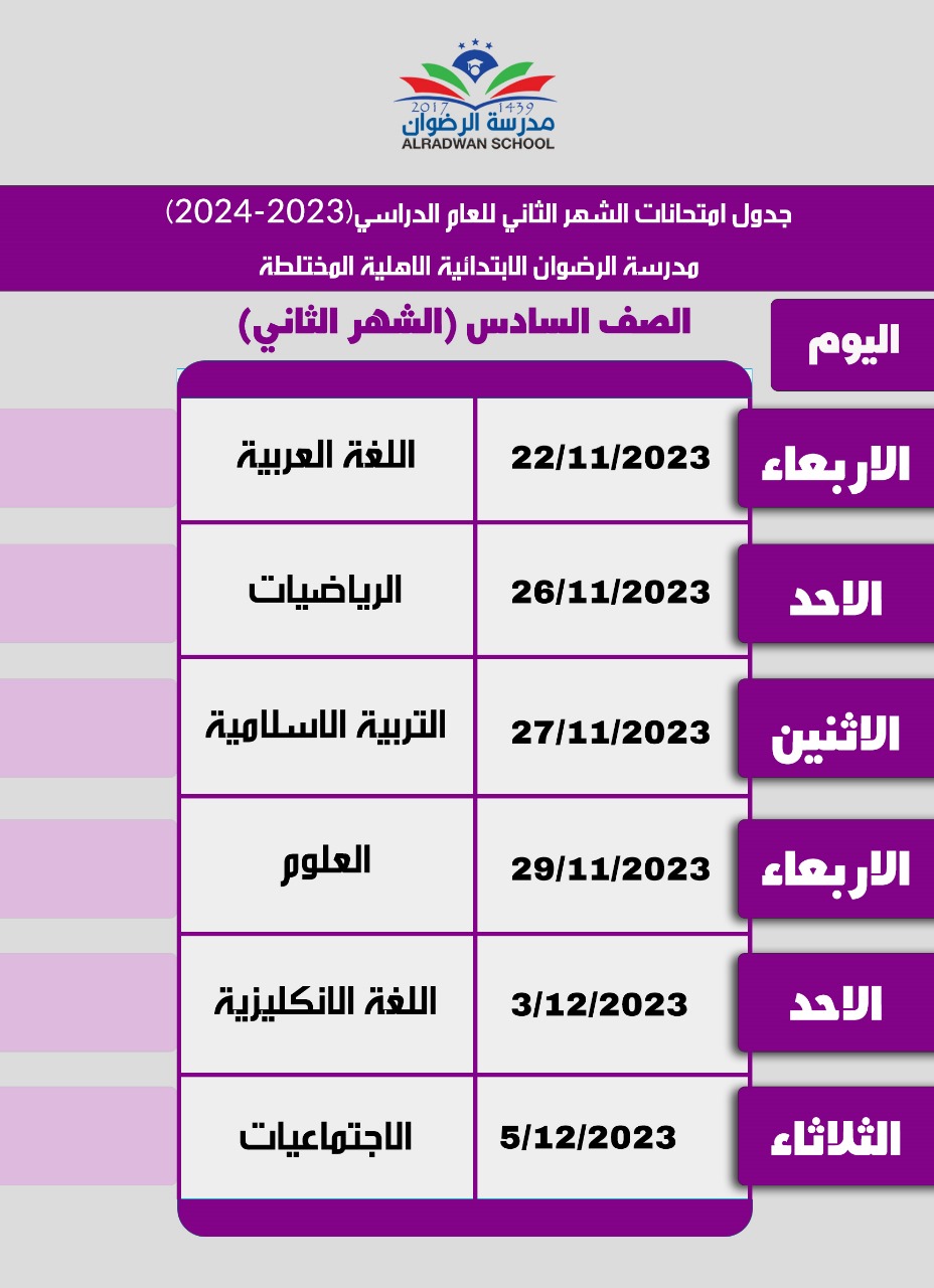 جدول الامتحانات الشهرية للصفوف ( الرابع - الخامس - السادس )